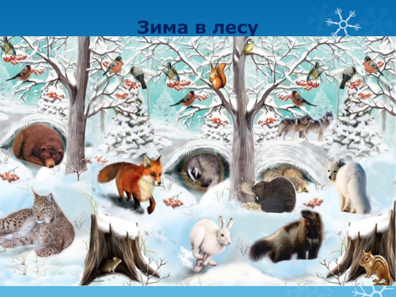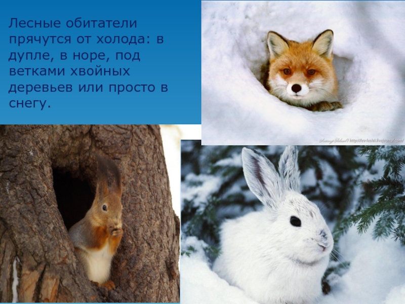 Слайд 11Лесные обитатели прячутся от холода: в дупле, в норе, под ветками