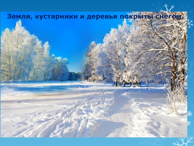 Слайд 4Земля, кустарники и деревья покрыты снегом.