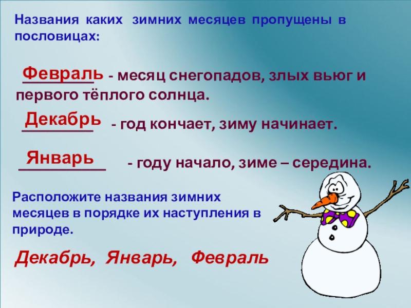 Расположите названия зимних месяцев в порядке их наступления в природе.