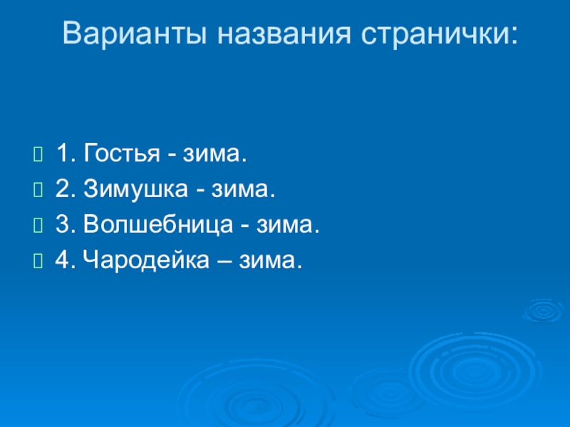 Варианты названия странички: 1. Гостья - зима.2. Зимушка - зима.3. Волшебница - зима.4. Чародейка – зима.