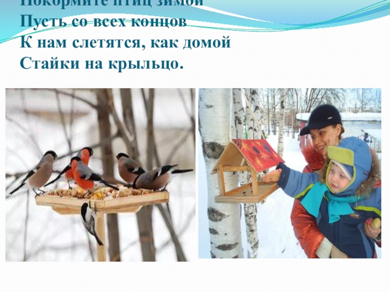 Слайд 10Покормите птиц зимой Пусть со всех концов К нам слетятся, как домой Стайки на