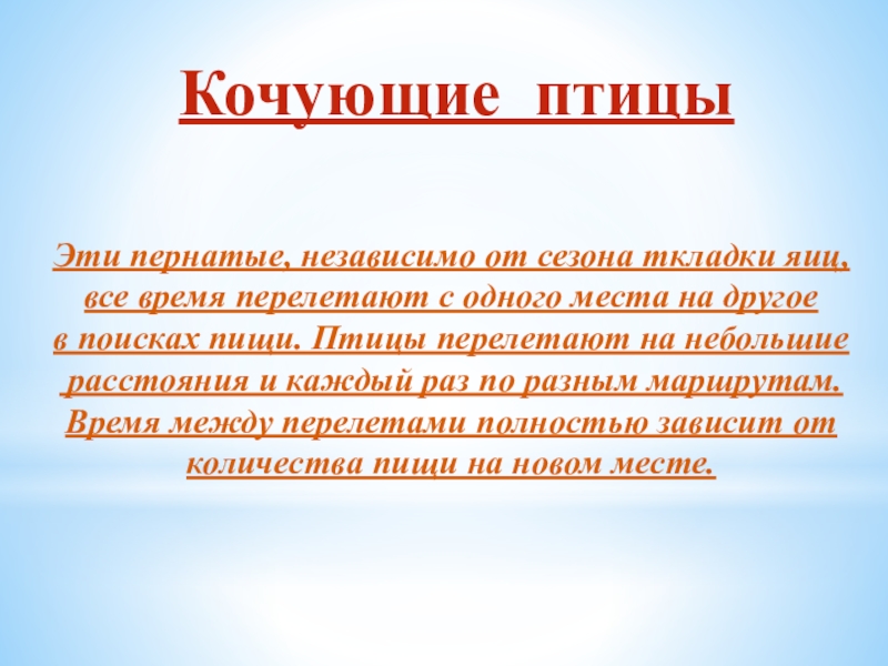 Кочующие птицы    Эти пернатые, независимо от сезона ткладки яиц, все время перелетают с одного