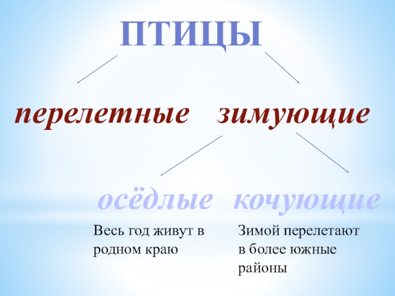птицыперелетныезимующиеосёдлыекочующиеВесь год живут в родном краюЗимой перелетают в более южные районы