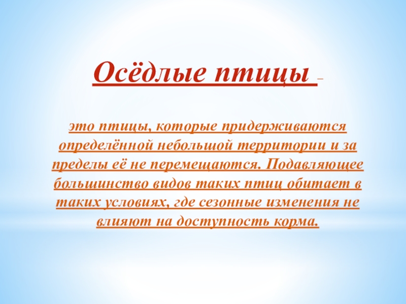 Осёдлые птицы – это птицы, которые придерживаются определённой небольшой территории и за пределы её не перемещаются. Подавляющее