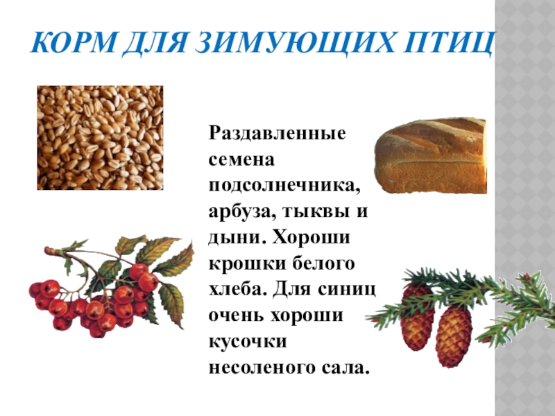 КОРМ ДЛЯ ЗИМУЮЩИХ ПТИЦРаздавленные семена подсолнечника, арбуза, тыквы и дыни. Хороши крошки белого хлеба. Для синиц очень