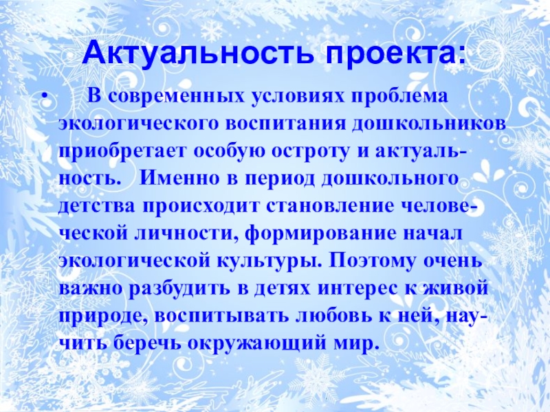 дошкольников приобретает особую остроту и актуаль-ность. Именно в период дошкольного детства происходит становление челове-ческой личности, формирование начал экологической культуры. Поэтому очень важно разбудить в детях интерес к живой природе, воспитывать любовь к ней, нау-чить беречь окружающий мир.