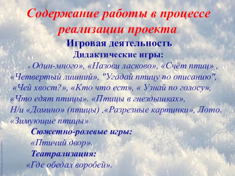 предметно – развивающая среда: литературой, фотографиями, иллюстрациями, стихотворениями, рассказами о птицах, загадками, презентациями о зимующих птицах.
