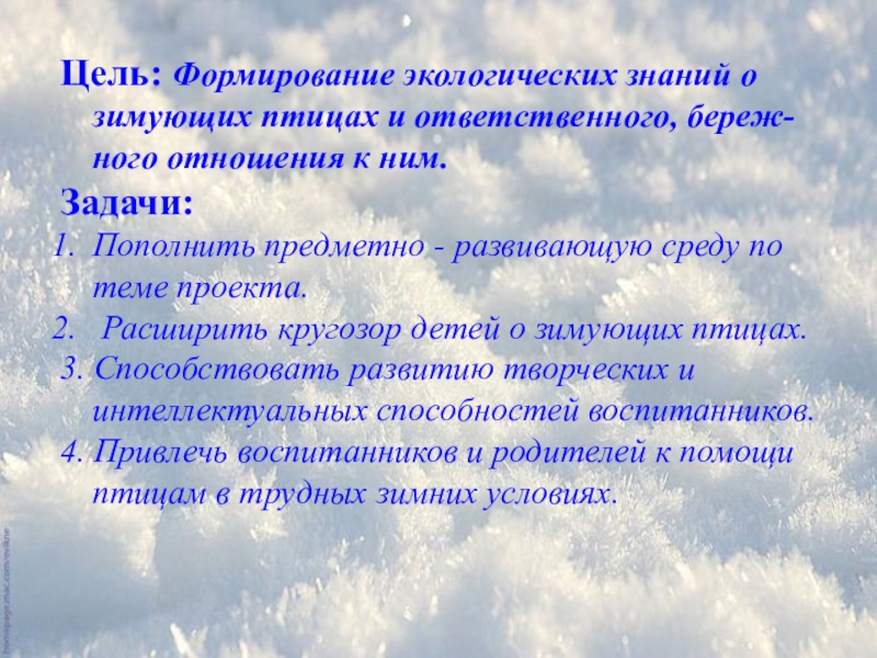 Цель: Формирование экологических знаний о зимующих птицах и ответственного, береж-ного отношения