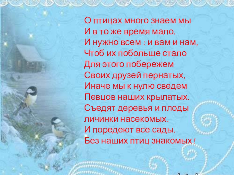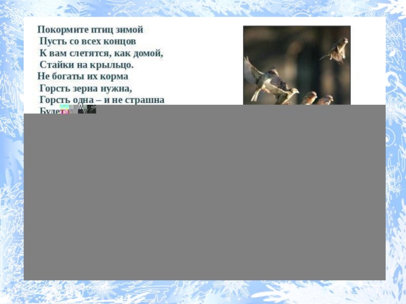 горок, отчаянная игра в снежки, но и крепкие морозы с прони-зывающим ветром. В холодное время года перед зимующими птицами встают жизненно важные вопросы: как прокормиться. Доступной пищи становится значительно меньше, но потребность в ней возрастает. Иногда естественный корм становится прак-тически недоступным, поэтому многие птицы не могут пережить зиму и погибают.