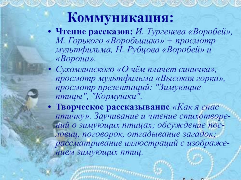 Сухомлинского «О чём плачет синичка», просмотр мультфильма «Высокая горка», просмотр презентаций: "Зимующие птицы", "Кормушки".
