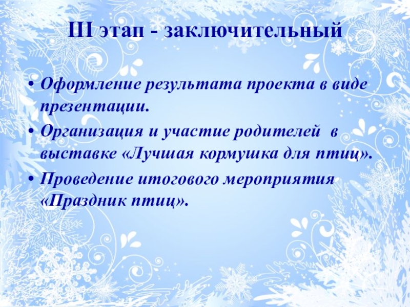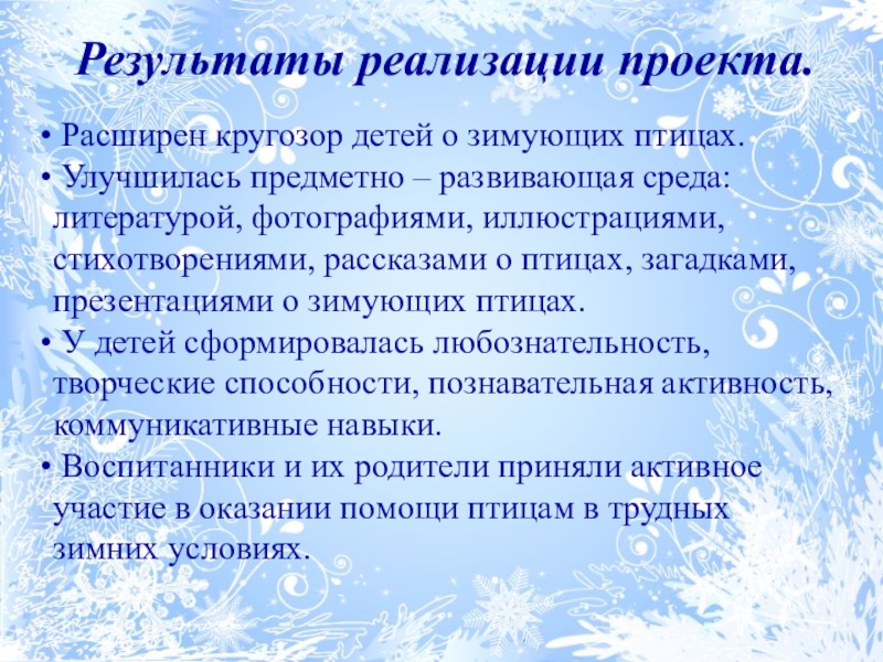 4. Привлечь воспитанников и родителей к помощи птицам в трудных зимних условиях.