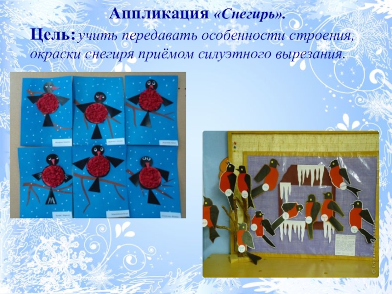 Цель: учить передавать особенности строения, окраски снегиря приёмом силуэтного