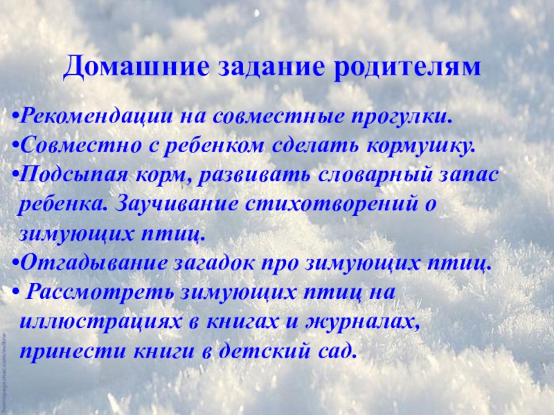 Рассмотреть зимующих птиц на иллюстрациях в книгах и журналах, принести книги в детский сад.