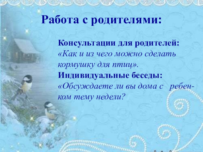 или вред приносят птицы?», «Меню птиц», «Как дети с родителями заботятся о птицах зимой?».