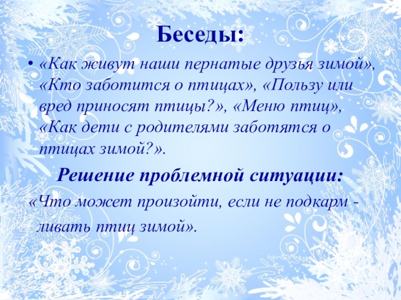 «Как живут наши пернатые друзья зимой», «Кто заботится о птицах», «Пользу