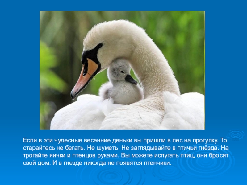 деньки вы пришли в лес на прогулку. То старайтесь не бегать. Не шуметь. Не заглядывайте в птичьи гнёзда. На трогайте яички и птенцов руками. Вы можете испугать птиц, они бросят свой дом. И в гнезде никогда не появятся птенчики.