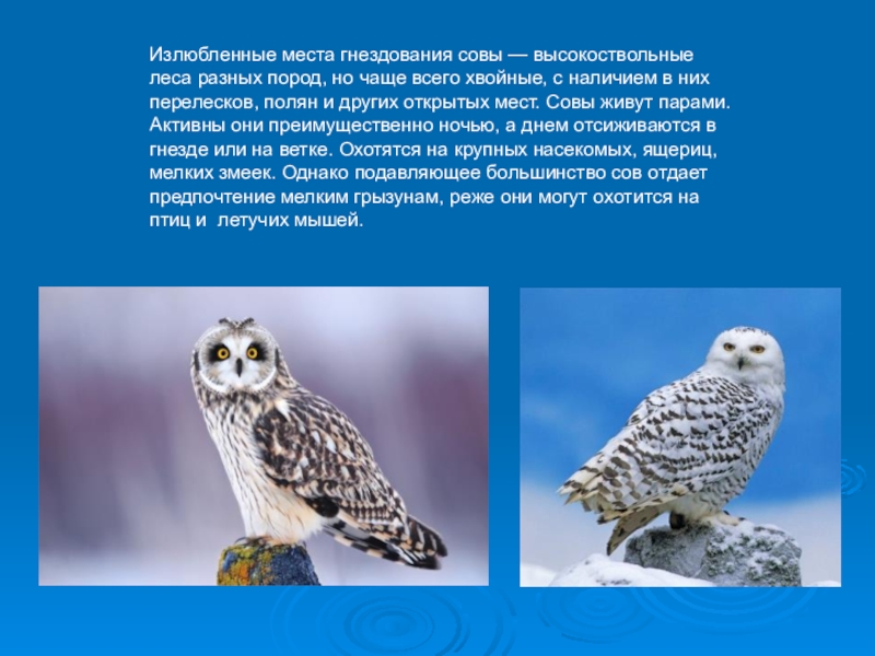 Слайд 10Излюбленные места гнездования совы — высокоствольные леса разных пород, но чаще