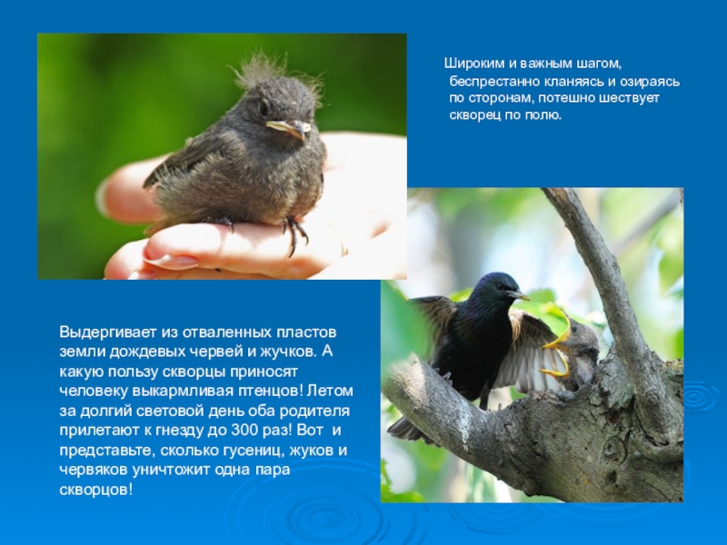 жучков. А какую пользу скворцы приносят человеку выкармливая птенцов! Летом за долгий световой день оба родителя прилетают к гнезду до 300 раз! Вот и представьте, сколько гусениц, жуков и червяков уничтожит одна пара скворцов!