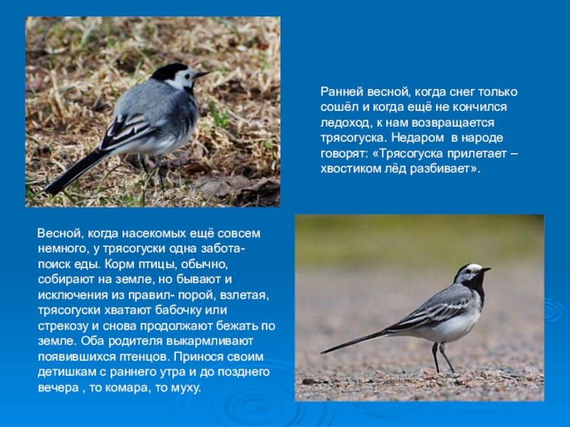 сошёл и когда ещё не кончился ледоход, к нам возвращается трясогуска. Недаром в народе говорят: «Трясогуска прилетает – хвостиком лёд разбивает».