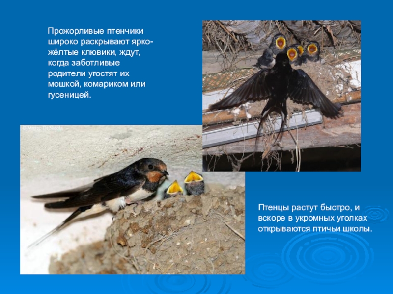 Слайд 18 Прожорливые птенчики широко раскрывают ярко-жёлтые клювики, ждут, когда