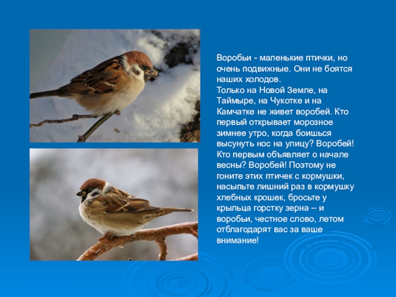 Слайд 3Воробьи - маленькие птички, но очень подвижные. Они не боятся наших