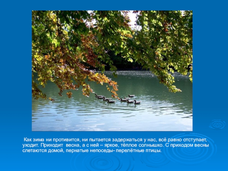 у нас, всё равно отступает, уходит. Приходит весна, а с ней – яркое, тёплое солнышко. С приходом весны слетаются домой, пернатые непоседы- перелётные птицы.