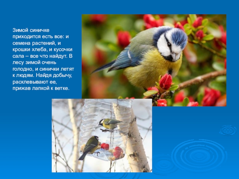 Слайд 4Зимой синичке приходится есть все: и семена растений, и крошки хлеба,