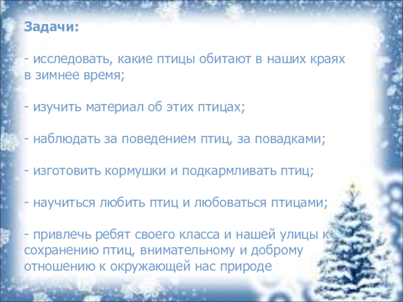 Слайд 4Задачи: - исследовать, какие птицы обитают в наших краях в зимнее время; -
