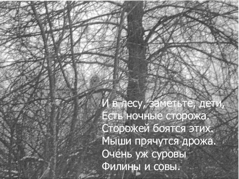 И в лесу, заметьте, дети,Есть ночные сторожа.Сторожей боятся этих.Мыши прячутся дрожа.Очень уж суровыФилины и совы.