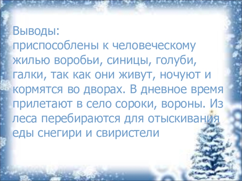 Слайд 21Выводы: приспособлены к человеческому жилью воробьи, синицы, голуби, галки, так как они