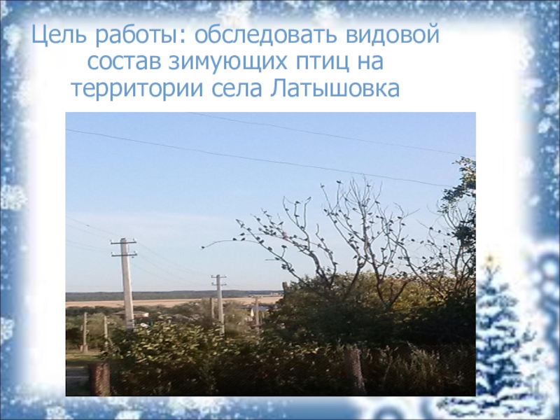 Слайд 3Цель работы: обследовать видовой состав зимующих птиц на территории села Латышовка