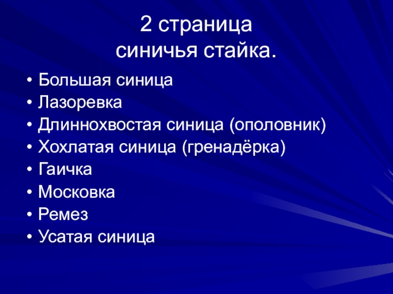 2 страница синичья стайка.Большая синица ЛазоревкаДлиннохвостая синица (ополовник)Хохлатая синица (гренадёрка)ГаичкаМосковкаРемезУсатая синица