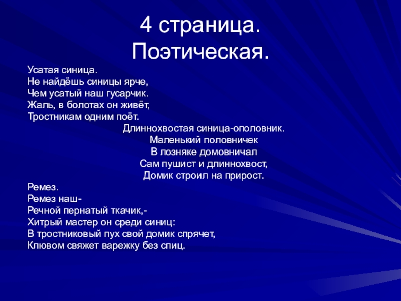 4 страница. Поэтическая.Усатая синица.Не найдёшь синицы ярче,Чем усатый наш гусарчик.Жаль, в болотах он живёт,Тростникам одним поёт.Длиннохвостая синица-ополовник.Маленький