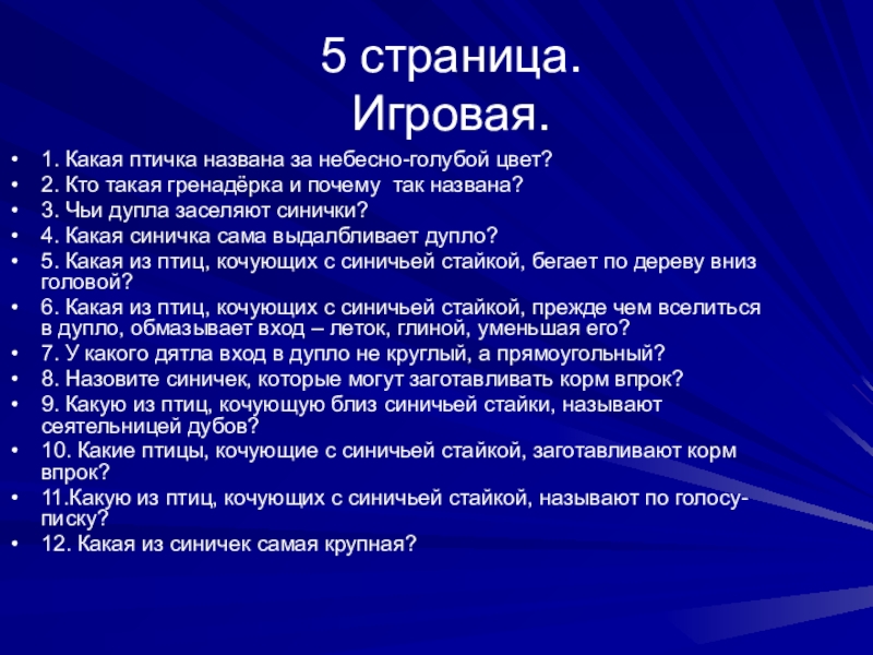 5 страница. Игровая.1. Какая птичка названа за небесно-голубой цвет?2. Кто такая гренадёрка и почему так названа?3. Чьи