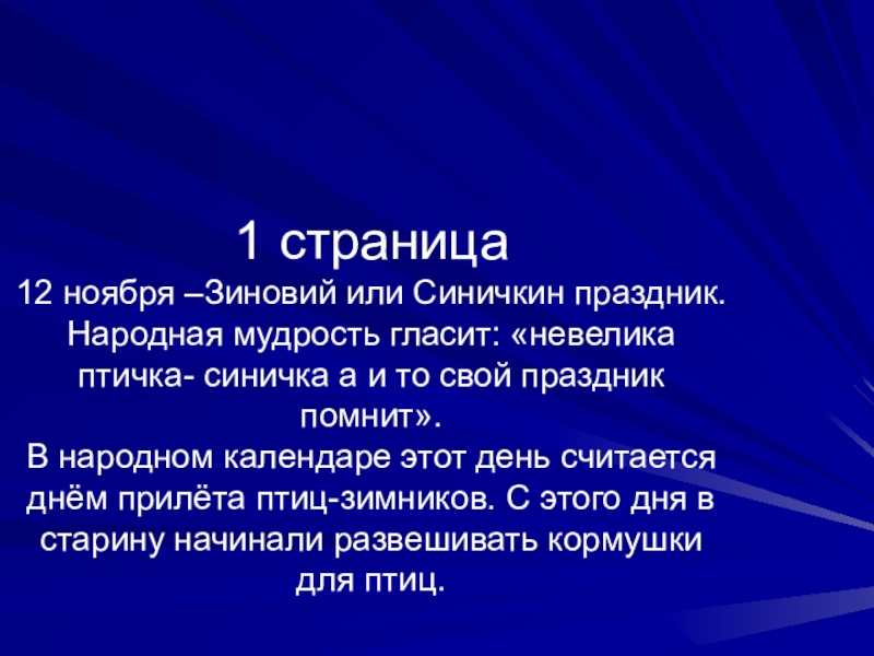 1 страница 12 ноября –Зиновий или Синичкин праздник. Народная мудрость гласит: «невелика птичка- синичка а и то свой праздник помнит». В народном календаре этот день считается днём прилёта птиц-зимников. С этого дня в старину начинали развешивать
