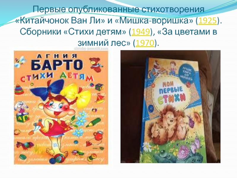 Слайд 5Первые опубликованные стихотворения «Китайчонок Ван Ли» и «Мишка-воришка» (1925). Сборники «Стихи