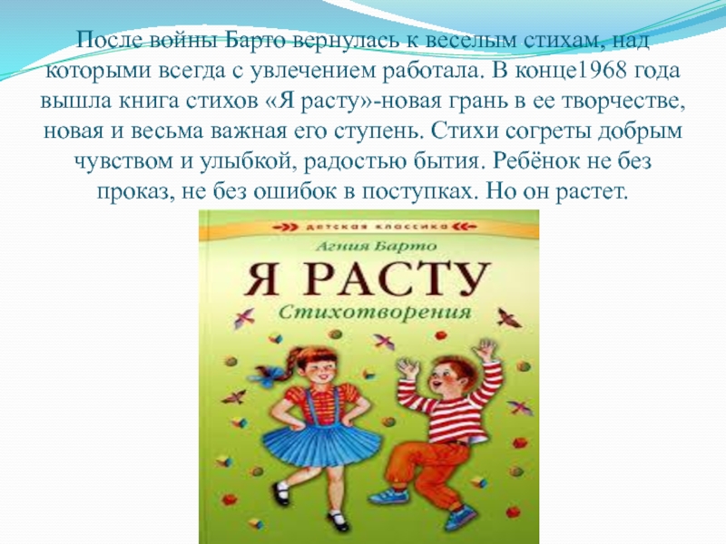 Слайд 11После войны Барто вернулась к веселым стихам, над которыми всегда с