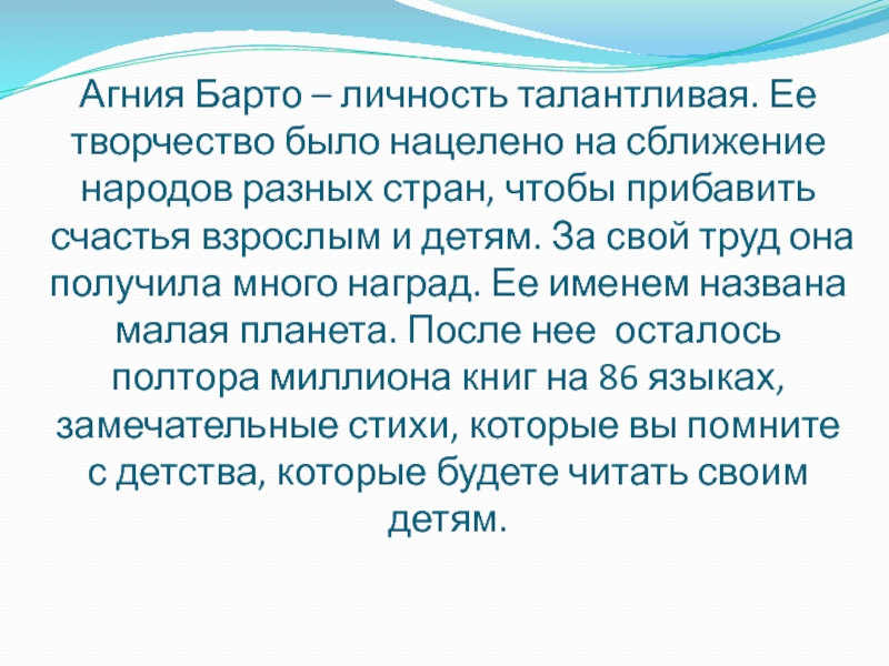 Слайд 13Агния Барто – личность талантливая. Ее творчество было нацелено на сближение