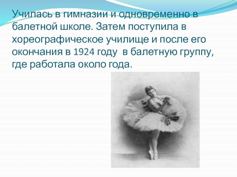 Слайд 4Училась в гимназии и одновременно в балетной школе. Затем поступила в