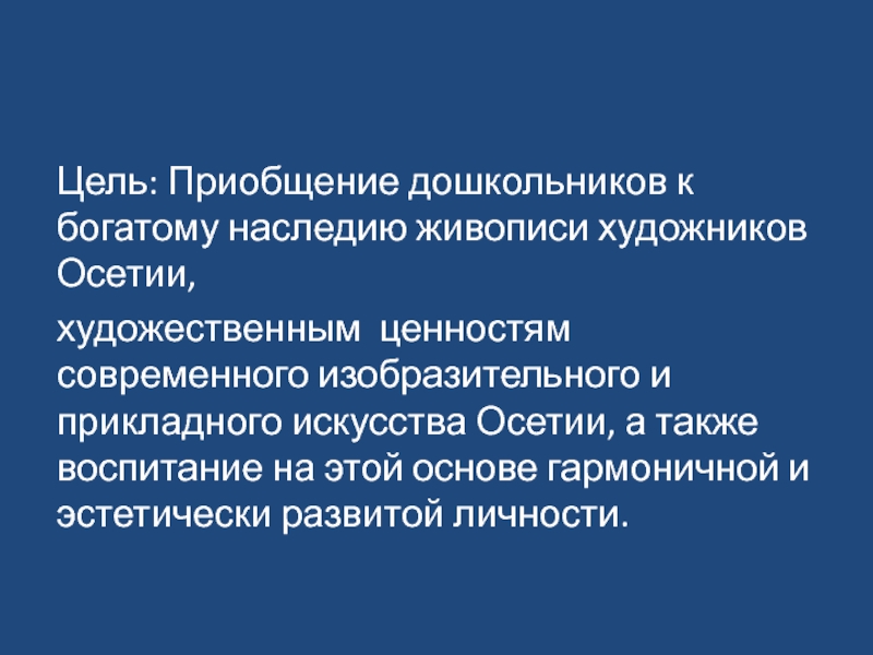 Слайд 2Цель: Приобщение дошкольников к богатому наследию живописи художников Осетии,