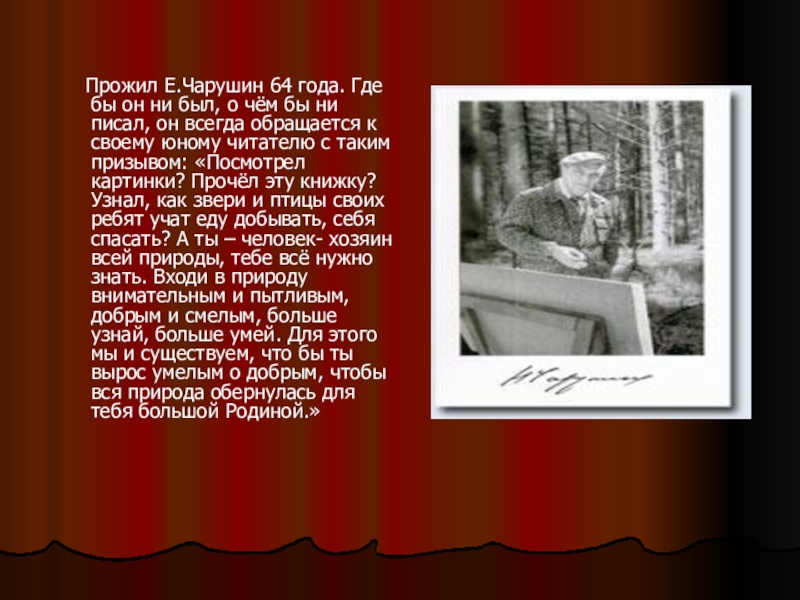 Слайд 7 Прожил Е.Чарушин 64 года. Где бы он ни был,