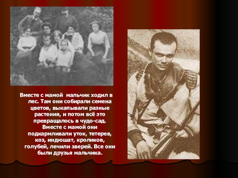 семена цветов, выкапывали разные растения, и потом всё это превращалось в чудо-сад. Вместе с мамой они подкармливали уток, тетерев, коз, индюшат, кроликов, голубей, лечили зверей. Все они были друзья мальчика.