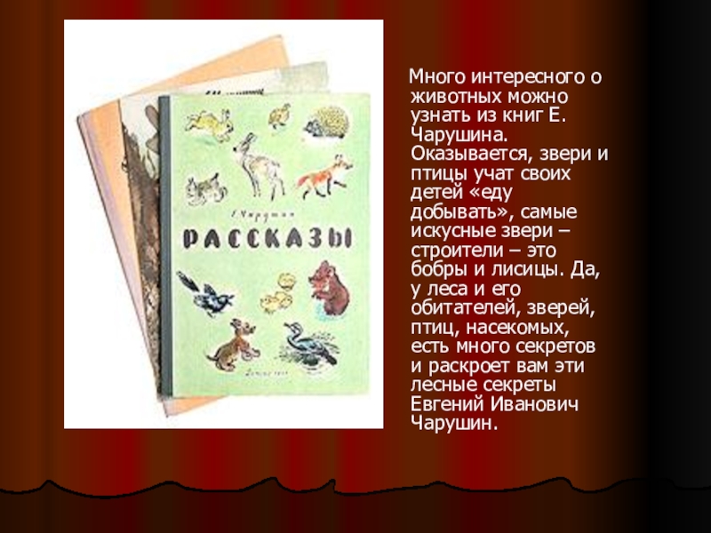 Слайд 6 Много интересного о животных можно узнать из книг Е.Чарушина.