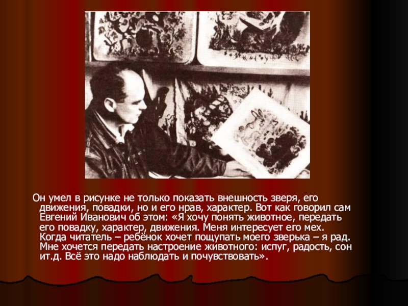 его движения, повадки, но и его нрав, характер. Вот как говорил сам Евгений Иванович об этом: «Я хочу понять животное, передать его повадку, характер, движения. Меня интересует его мех. Когда читатель – ребёнок хочет пощупать моего зверька – я рад. Мне хочется передать настроение животного: испуг, радость, сон ит.д. Всё это надо наблюдать и почувствовать».