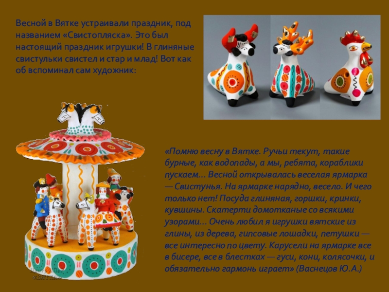 Весной в Вятке устраивали праздник, под названием «Свистопляска». Это был настоящий праздник игрушки! В глиняные свистульки свистел и стар и млад! Вот как об вспоминал сам художник: