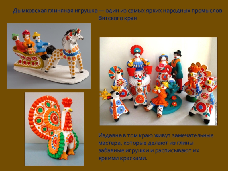 Издавна в том краю живут замечательные мастера, которые делают из глины забавные игрушки и расписывают их яркими красками.