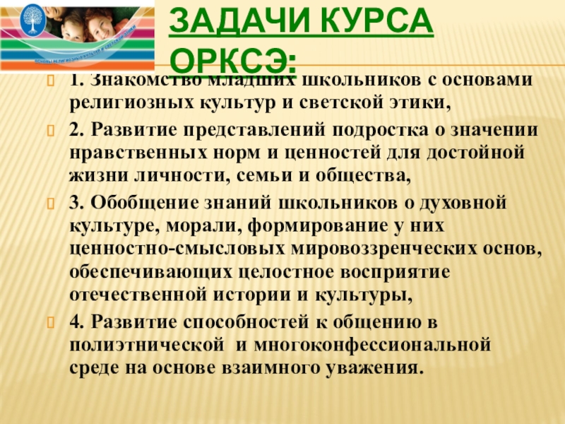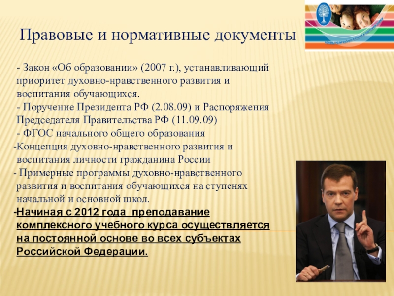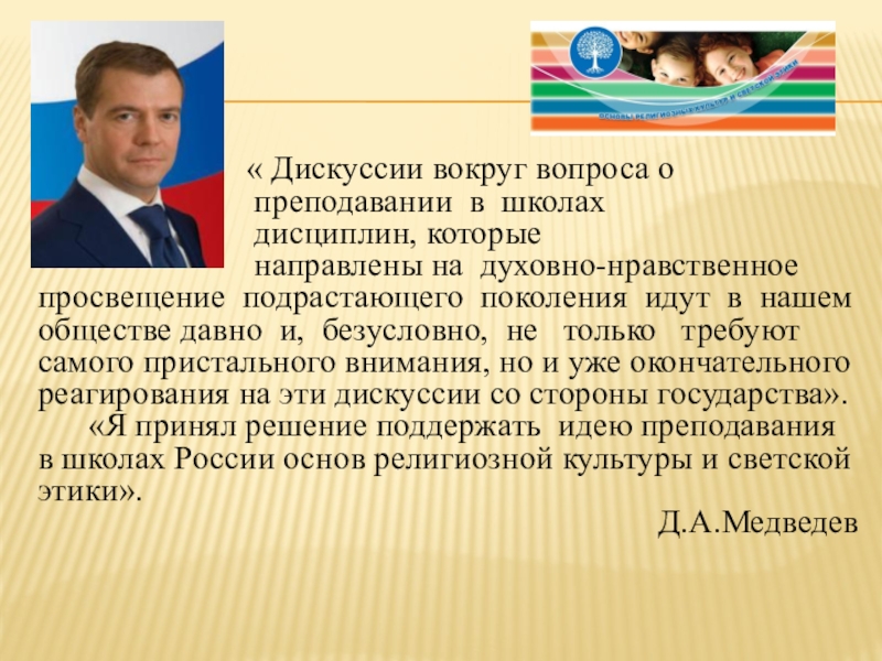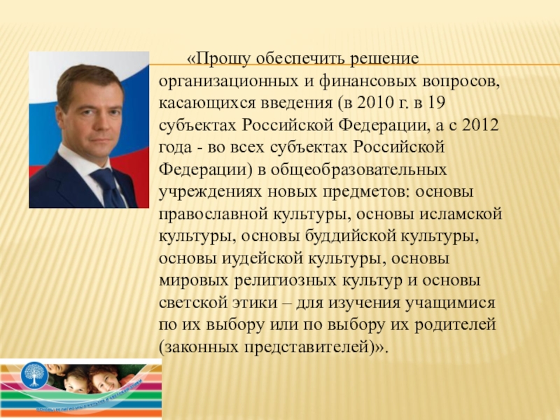 «Прошу обеспечить решение организационных и финансовых вопросов, касающихся введения (в 2010 г. в 19 субъектах Российской Федерации, а с 2012 года - во всех субъектах Российской Федерации) в общеобразовательных учреждениях новых предметов: основы православной культуры, основы исламской культуры, основы буддийской культуры, основы иудейской культуры, основы мировых религиозных культур и основы светской этики – для изучения учащимися по их выбору или по выбору их родителей (законных представителей)».