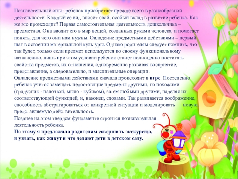 Слайд 6Познавательный опыт ребенок приобретает прежде всего в разнообразной