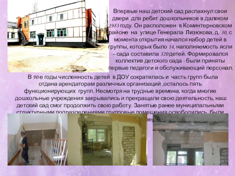 Впервые наш детский сад распахнул свои двери для ребят-дошкольников в далеком 1983 году. Он расположен в Коминтерновском районе на улице Генерала Лизюкова, д. 30, с момента открытия начался набор детей в группы, которых было 14, наполняемость ясли – сада составила 320 детей. Формировался коллектив детского сада - были приняты первые педагоги и обслуживающий персонал.