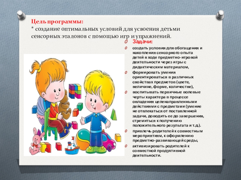 создать условия для обогащения и накопления сенсорного опыта детей в ходе предметно-игровой деятельности через игры с дидактическим материалом,